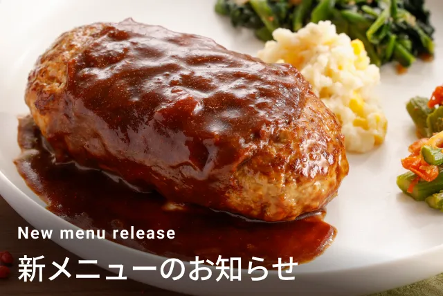 3種のきのことチーズのコクが、トマトソースの酸味にマッチしたハンバーグです。