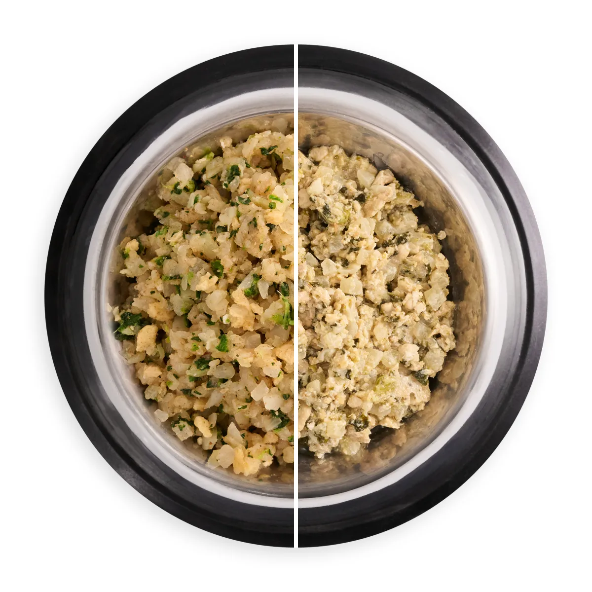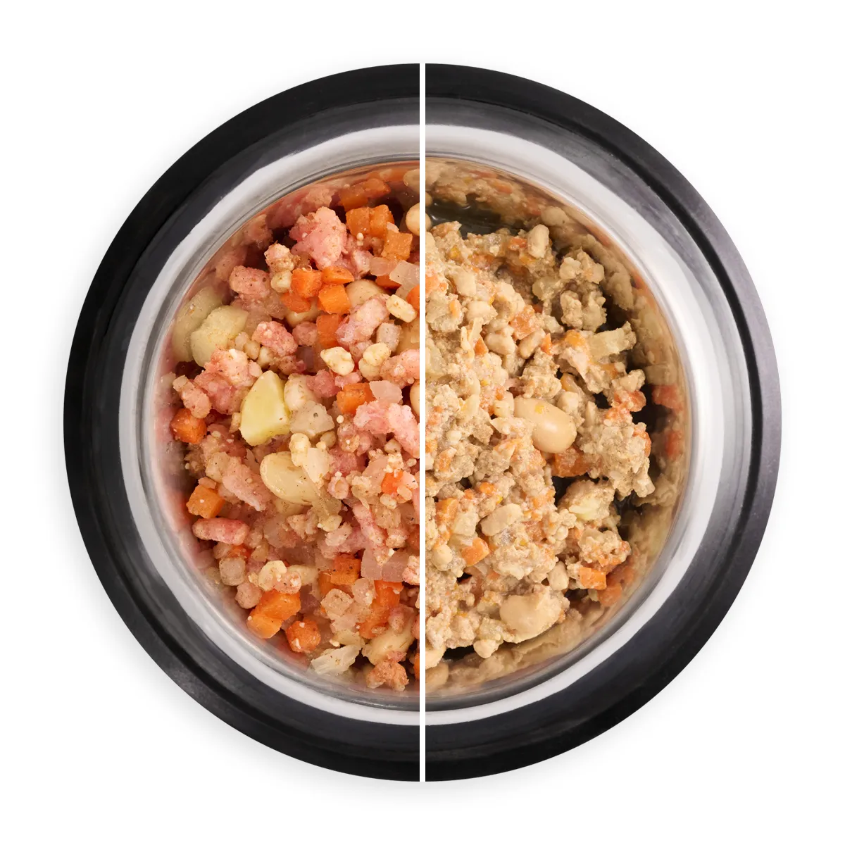 脂身が少なく旨みのある豚ひき肉に、やさしい甘みの大根とにんじん、じゃがいも、キャベツの素朴な風味を組み合わせました。大根は消化を助ける酵素を含み、にんじんはβ-カロテンが豊富で健康維持に役立ちます。じゃがいもはエネルギー源となる炭水化物やビタミンCを含み、腹持ちを良くして満足感を高めます。